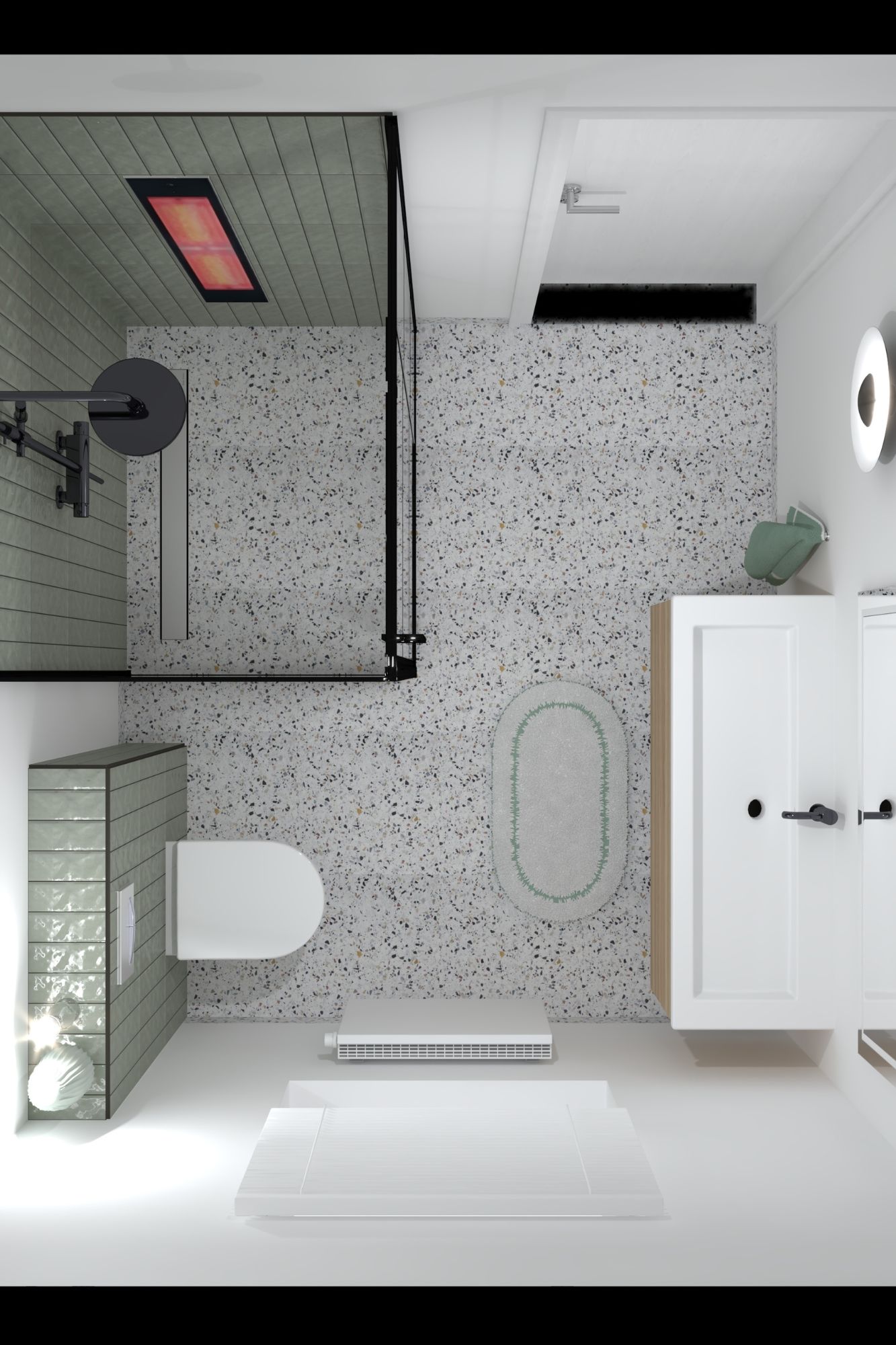 Deze compacte badkamer combineert functionaliteit met stijl. De groene wandtegels voegen een modern accent toe, terwijl het terrazzo vloerdetail een speels en elegant contrast creëert. Het zwevende toilet en de glazen scheidingswand versterken de ruimte en zorgen voor een open gevoel.