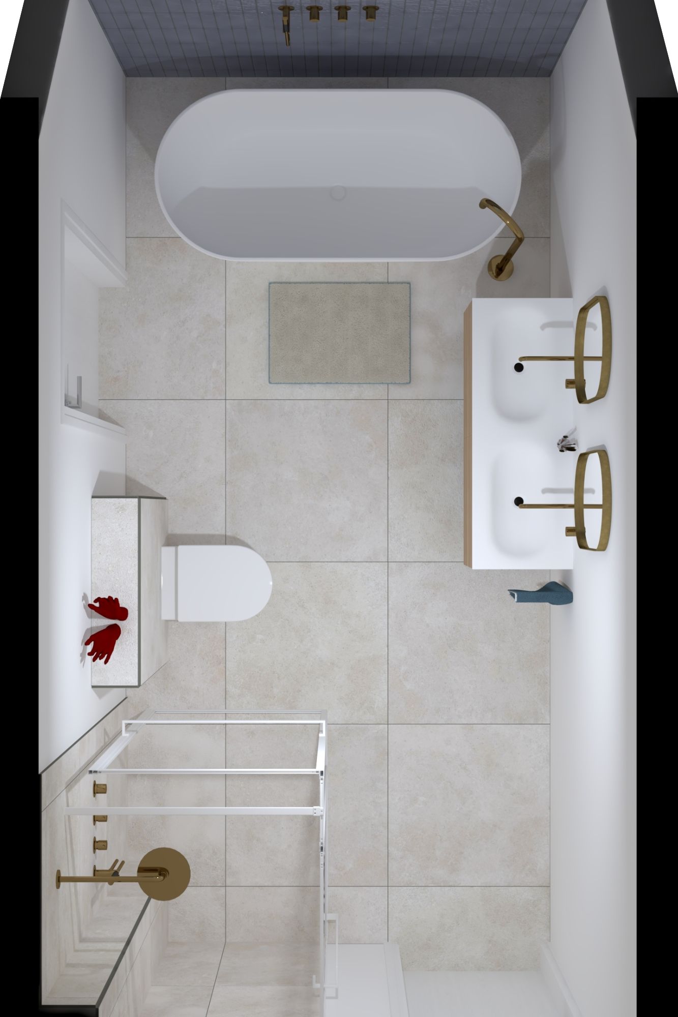 Deze badkamer combineert modern design met tijdloze elegantie. De strakke lijnen van de gouden kranen en de rustgevende neutrale kleuren zorgen voor een harmonieuze uitstraling. Elk element is zorgvuldig gekozen om luxe en functionaliteit samen te brengen in één ruimte.