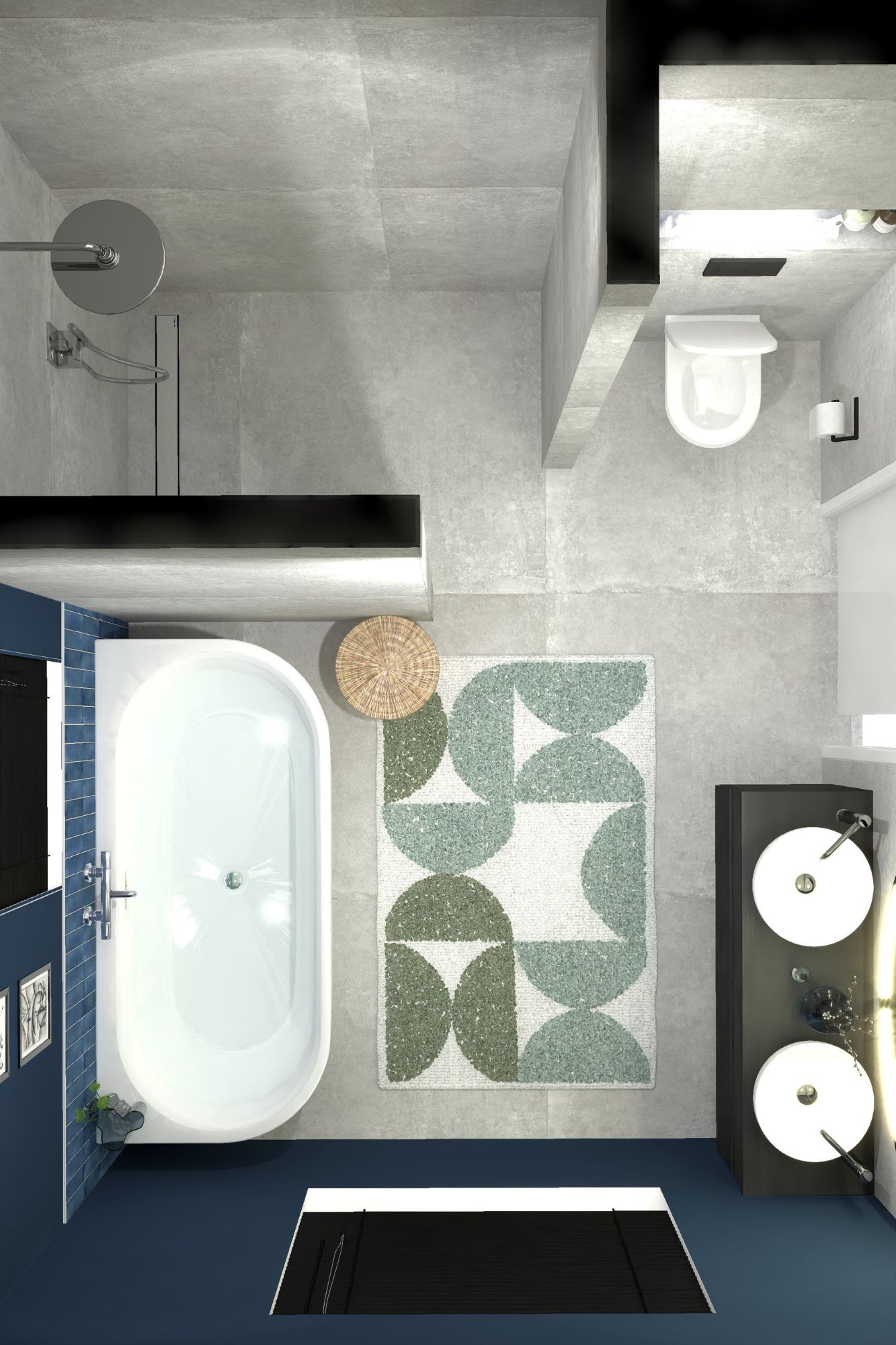 De grijze betonlook muren geven een industriële touch aan de badkamer. Tegelijkertijd zorgt het warme blauw voor een uitnodigende sfeer. Deze unieke combinatie maakt de ruimte ideaal voor ontspanning en functionaliteit, met een perfecte balans tussen design en comfort.