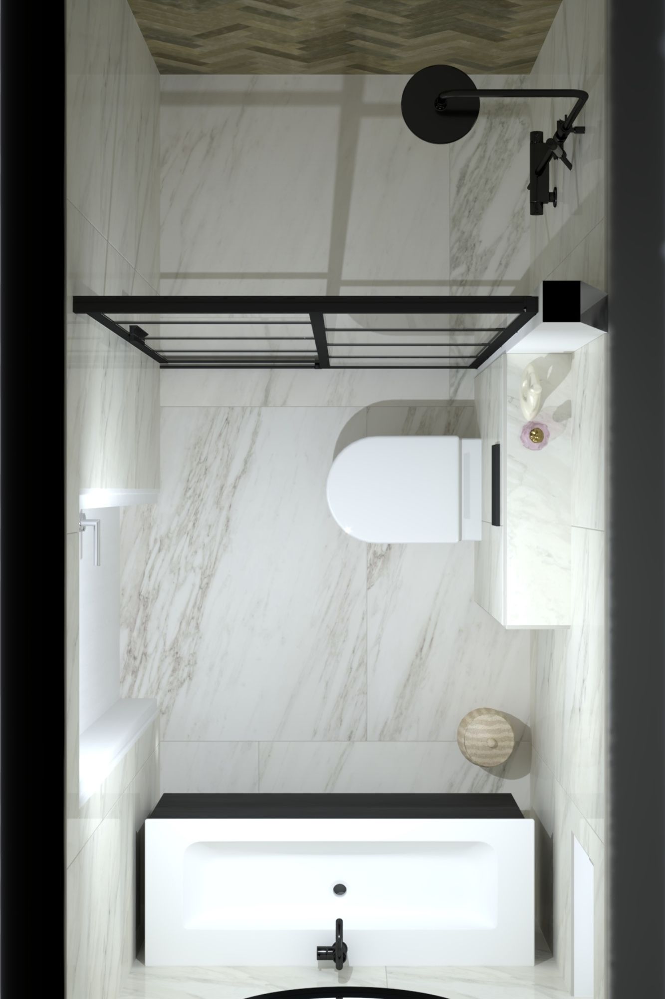De inloopdouche met glazen wanden en een visgraattegelpatroon biedt een stijlvol contrast met het marmer. Het ontwerp is zowel functioneel als visueel indrukwekkend, perfect voor wie houdt van design en comfort in één ruimte.