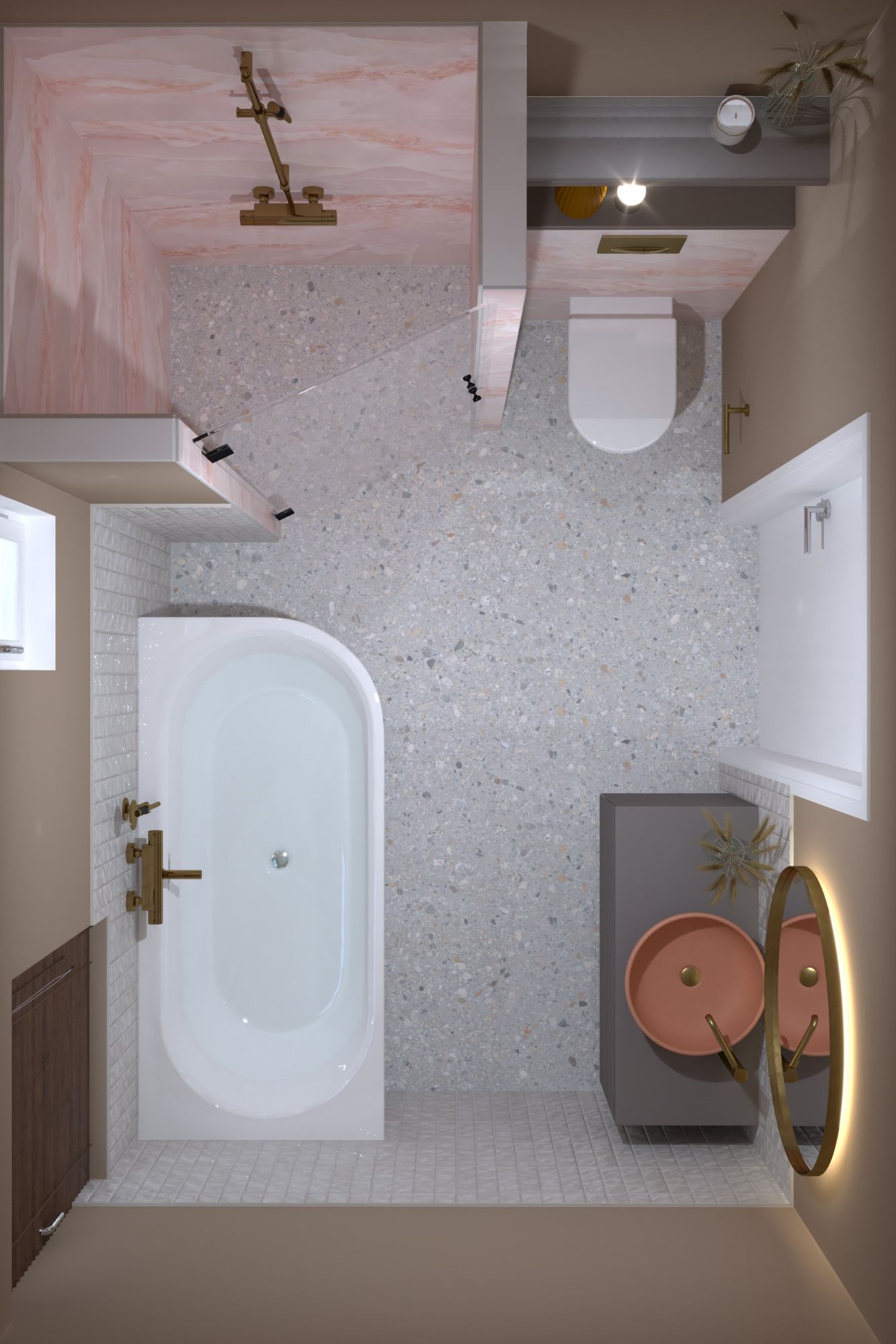 Deze badkamer laat zien hoe een compacte ruimte kan worden omgetoverd tot een stijlvolle oase. Het ontwerp maakt gebruik van een serene kleurencombinatie en luxe details zoals een ronde roze waskom en gouden accenten, die samen zorgen voor een warme en elegante uitstraling.