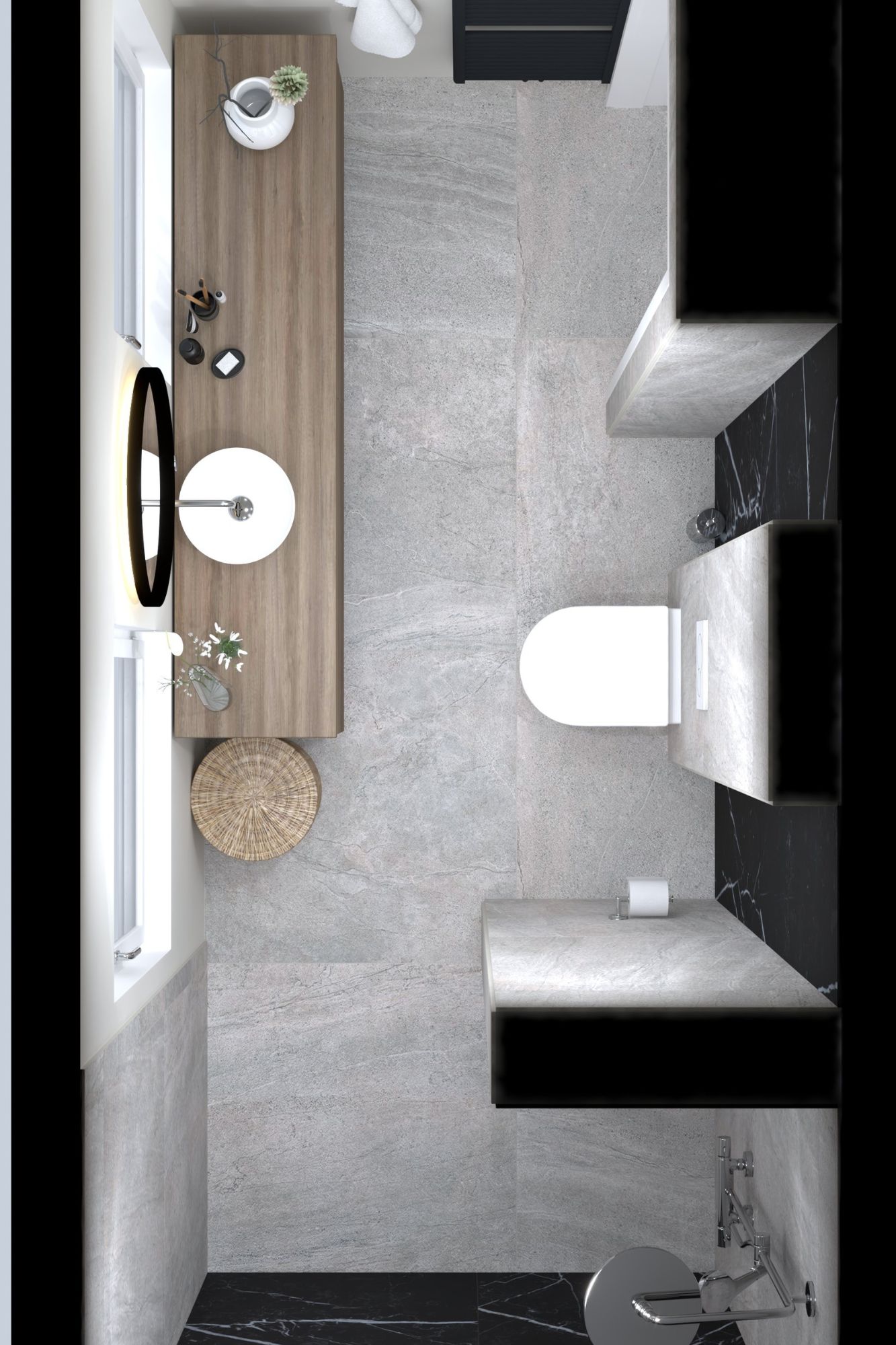 De zwevende toiletopstelling en subtiele details, zoals ingebouwde opbergmogelijkheden, maximaliseren de ruimte-efficiëntie. Het contrast tussen lichte en donkere tinten voegt diepte toe aan de badkamer, wat het ontwerp een extra dimensie geeft.