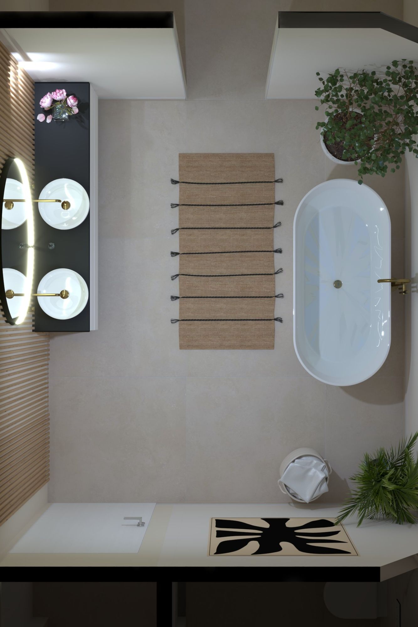 De gouden details geven een gevoel van luxe, terwijl het gebruik van hout en natuursteen een warme ambiance creëert. Het grote ronde spiegel met sfeerverlichting benadrukt het moderne ontwerp. Deze badkamer biedt een inspirerende omgeving waar functionaliteit en esthetiek naadloos samenkomen, ideaal voor dagelijks comfort.