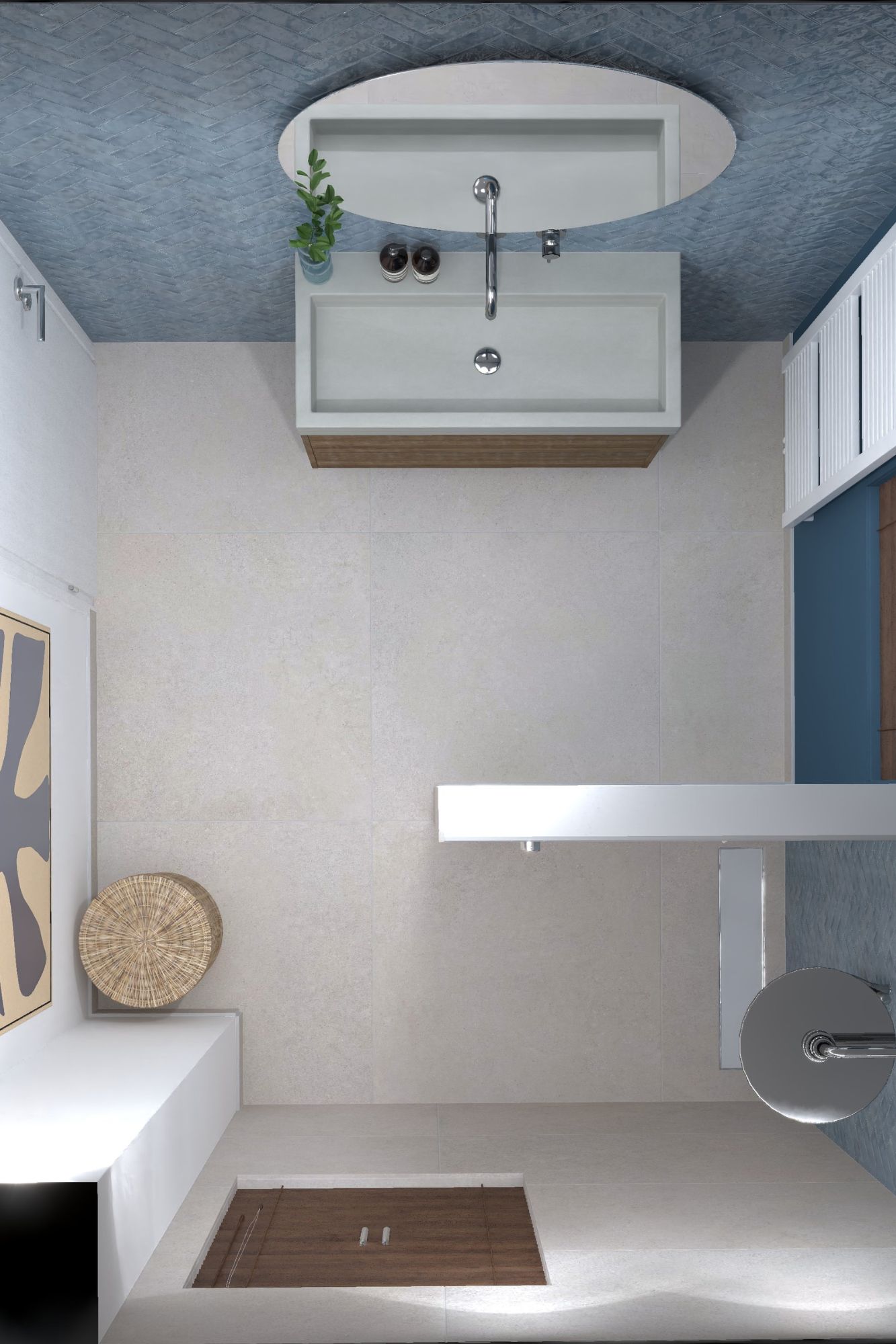 Deze badkamer combineert stijl en functionaliteit perfect. De blauwe tegels in visgraatmotief brengen een unieke uitstraling, terwijl het strakke witte sanitair voor een tijdloze look zorgt. Ideaal voor een moderne woning met oog voor detail en comfort.
